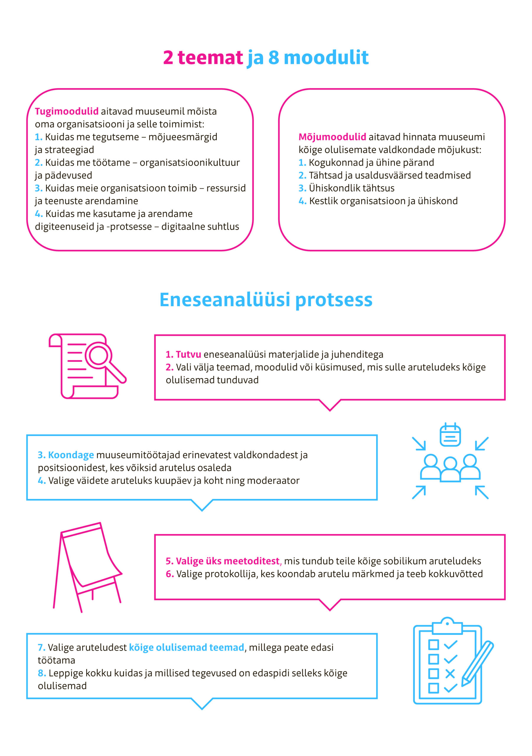 151 väidet on grupeeritud kaheksaks teemaks. Iga teema jaguneb kaheks teemamooduliks (joonis). Nelja tugimooduli väited aitavad mõista organisatsiooni ja teha asutuse toimimise analüüsi, küsides, kes me oleme, kuhu läheme, milline on muuseumi ümber olev koostöövõrgustik, millised on ressursid, oskused ja vajadused. Eraldi alateema on digitaalsed teenused ja suhtlus, mida tõid muuseumid esile just olulise arendamisvajadusena. Nelja mõjumooduli väited aitavad hinnata muuseumi kõige olulisemate valdkondade mõjukust ning seda, kuidas oma tegevusega mõjutada ühiskonda neljas valdkonnas: kogukonnad ja ühine pärand; tähtsad ja usaldusväärsed teadmised; ühiskondlik tähtsus; kestlik organisatsioon ja ühiskond.